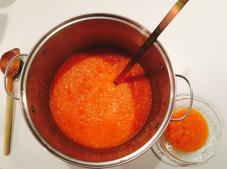 Since my training is “starting from scratch” this year, yesterday’s five treadmill miles served as this week’s long run. And although I had a broiled hot dog and baked potato for dinner last night, tonight I made Carrot-Ginger soup for inflammation (& my mom’s cold).