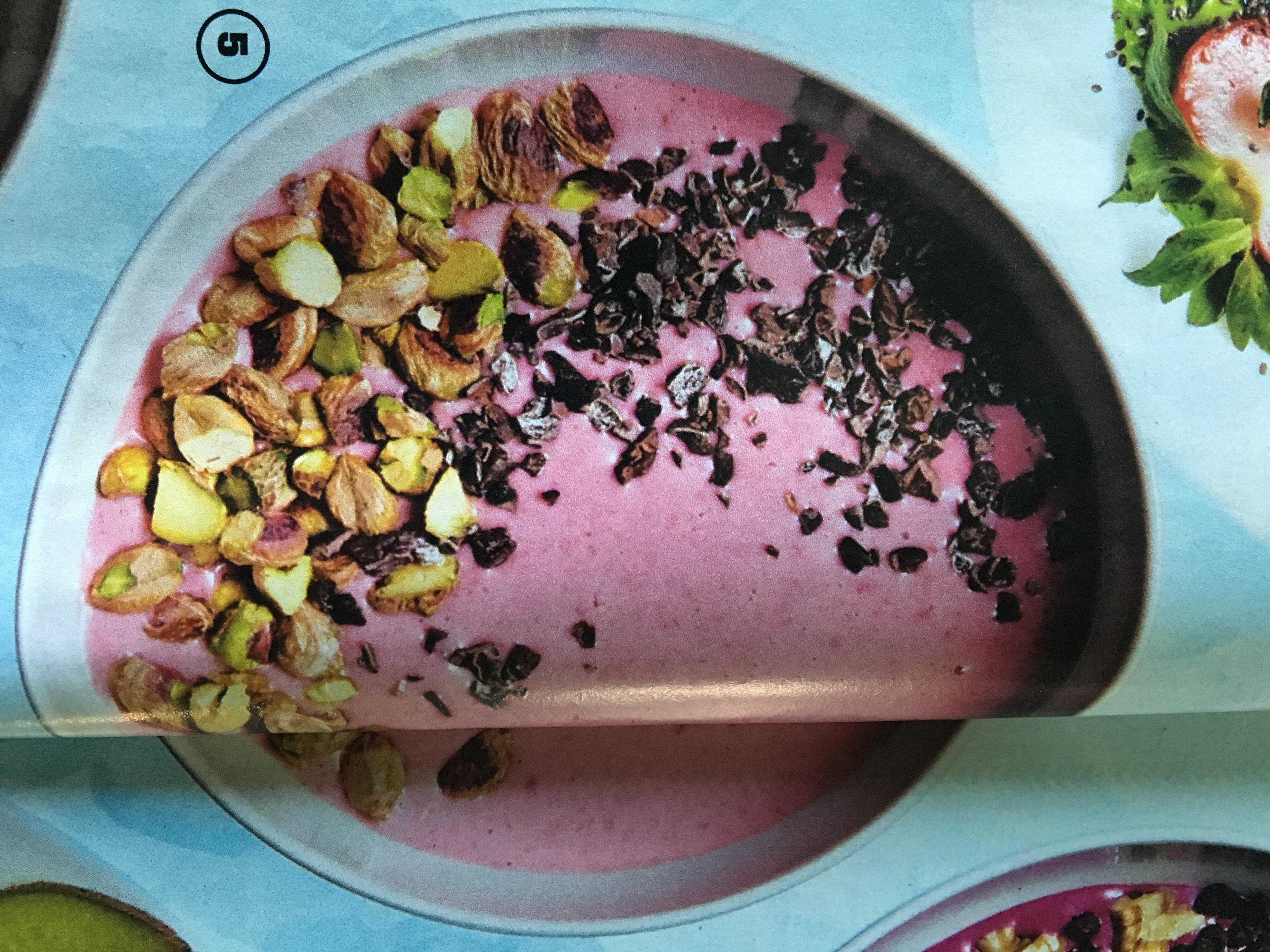 I sorted through all three of my “running” cookbooks (the Runner’s World Cookbook, Runner’s World Meals on the Run, and Run Fast Eat Slow) as well as the recent issue of Runner’s World magazine (August 2017), which had the article Smooth Move with smoothie bowl recipes. I picked out six recipes with slightly similar ingredients so that if I had to buy it, I would get good use out of it. The ingredients I did have to run out for were the frozen fruits (cherries, raspberries, pineapple, and mango- I usually have mixed berry bags in the freezer), pistachios, mint, and watermelon, as well as kefir (which I found at Nino’s). Friday afternoon, before I went to dinner, I made all the smoothies. I measured all the ingredients. Even the fruit and milk quantities. Even the tablespoons and teaspoons. I wasn’t going to risk ruining the smoothie with the already-questionable-ingredient choices by screwing up the proportions. After, five friends came over. Yes, five brave, awesome, and trusting friends came over.
