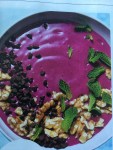 Then we tried Red Velvet Cheesecake (RW magazine). Topped with chocolate chips, this smoothie was comprised of ricotta cheese, cherries, banana, milk, and cinnamon. I didn’t add the beet even though the last beet smoothie recipe wasn’t all that bad. I also didn’t top with walnuts or mint leaves since that was done for some of the others we tried. To my surprise, my friends remarked it was “very good!” The chocolate chips were a great addition; Jessica loved it! Zak suggested the use of less cinnamon or to maybe add nutmeg. Everyone seemed to enjoy it until I told them there was ricotta cheese in it!
