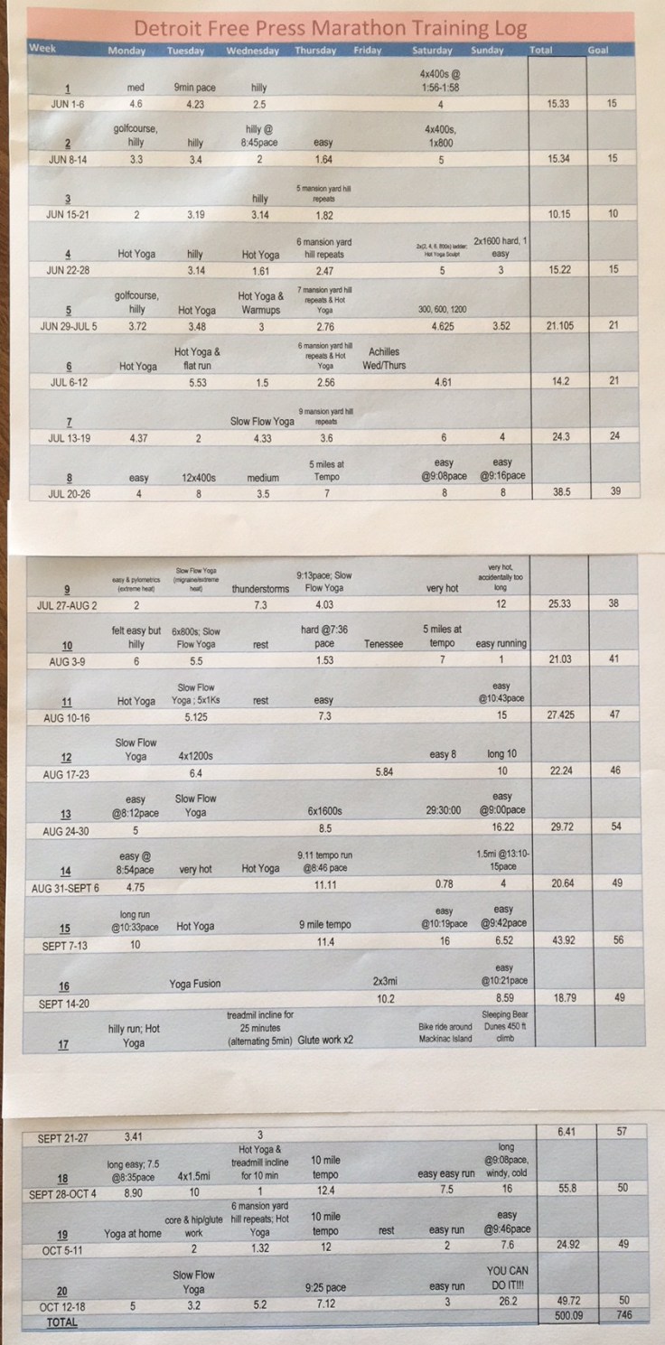 Here’s a picture of the log I made for the my first marathon. I wasn’t kidding about how much I went to yoga to cross-train.