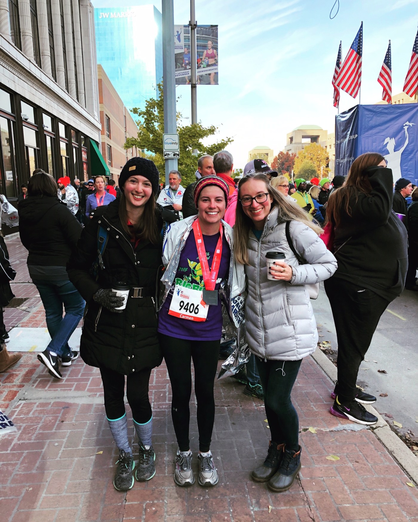 Maybe it was because the race was the weekend following Halloween but there were quite a few spectators dressed in costume or in onsies! All the more entertaining… One of my favorite spectator signs I saw was something along the lines of, “so this is you working off all of your kid’s candy you inspected!” I really loved the last few miles of the race. They’re hard for many and at the Monumental race as you’re heading back into downtown you really felt like you were on the homestretch. There were a lot more spectators lining the course and whether they were yelling encouragement or not, they were out there in the cold waiting for somebody. As expected, it was even more packed near the finish! I heard my name being called from the left but I couldn’t spot Amanda and Clare. I got a medal, hat, cookie, and chocolate milk, there may have been more goodies that I missed. I easily found my friends at our pre-determined meeting spot. They got finish line pictures of me!