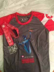 The course was true and flat. The only inclines were brief 10 foot hikes over bridges. Nothing to worry about! The race shirt was a t-shirt, which I prefer to longsleeve shirts, and the medal is quite heavy (and designed to be a part of a four-year race streak).