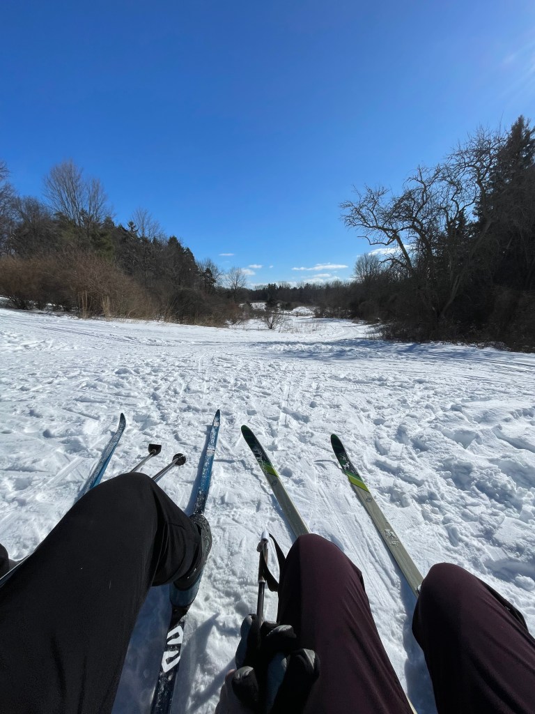 We cross country skied afterwards. You don’t have to pay anything extra if you bring your own equipment. I was excited; we wanted to go earlier in the year when we first got dumped with snow, but alas, as you’ve read, we were sick! Or the weather was bitterly cold to the point of zoo closures, as an example. This was a beautiful sunny day. About three miles in, I was feeling tired – I already had about 45 minutes of rest post-run. It’s the cardio-part of it that had me down, not the strain on the legs. I started to fall from fatigue and took my skis off at one downhill to walk down. I felt that I was too tired to control myself on the steep hill and surely would have wiped out. Still, it was really fun; we went a little more than 4.5 miles. We wanted to go again but so far – no more snow! Which leads us to running!